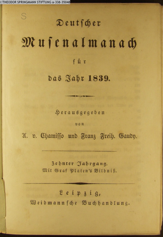 Deutscher / Musenalmanach / für / das Jahr 1839. / Herausgegeben / von A. v. Chamisso und Franz Freih. Gaudy. / Zehnter Jahrgang. / Mit Graf Platen's Bildniß. / Leipzig, / Weidmannsche Buchhandlung