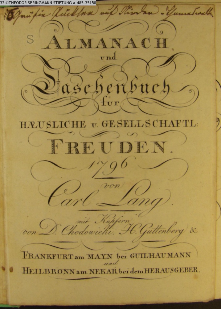 ALMANACH / und / Taschenbuch / für / HAEUSLICHE / u. GESELLSCHAFTL. / FREUDEN. / 1796. / von / Carl Lang. / mit Kupfern / von D. Chodowiecki, H. Guttenberg / FRANKFURT am MAYN bei GUILHAUMANN / HEILBRONN am NEKAR bei dem HERAUSGEBER