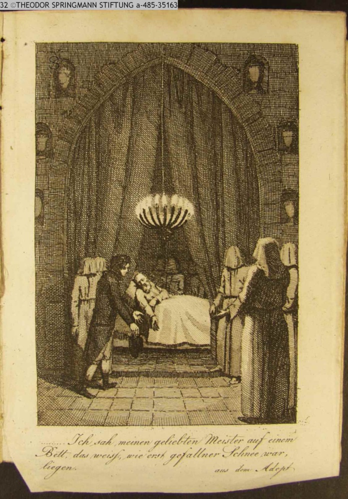 Ich sah meinen geliebten Meister auf einem / Bett, das weiß, wie erst gefallner Schnee war, / liegen / aus dem Adept
