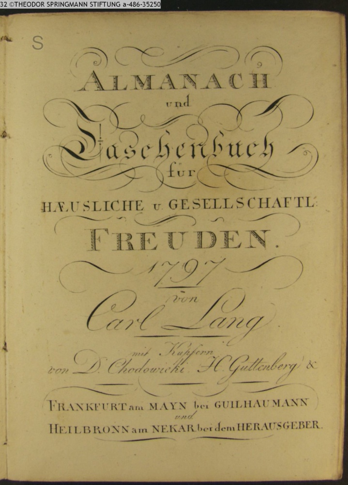 ALMANACH / und / Taschenbuch / für / HAEUSLICHE / u. GESELLSCHAFTL. / FREUDEN. / 1797. / von / Carl Lang. / mit Kupfern / von D. Chodowiecki, H. Guttenberg & / FRANKFURT am MAYN bei GUILHAUMANN / HEILBRONN am NEKAR bei dem HERAUSGEBER