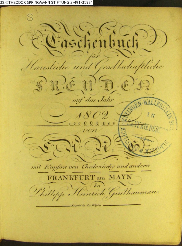 Taschenbuch / für / Haeusliche und Gesellschaftliche / FREUDEN / auf das Jahr / 1802 / von / LANG / mit Kupfern von Chodowiecky und andern / FRANKFURT am MAYN / bei / Phillipp Heinrich Guilhauman
