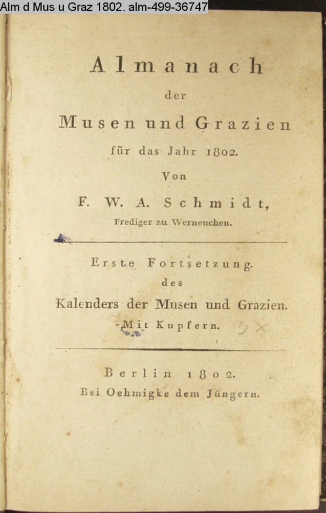 Almanach / der / Musen und Grazien / für das Jahr 1802. / Von / F. W. A. Schmidt, / Prediger zu Werneuchen. / Erste Fortsetzung. / des / Kalenders der Musen und Grazien / Mit Kupfern. / Berlin 1802 / Bei Oehmigke dem Jüngern.