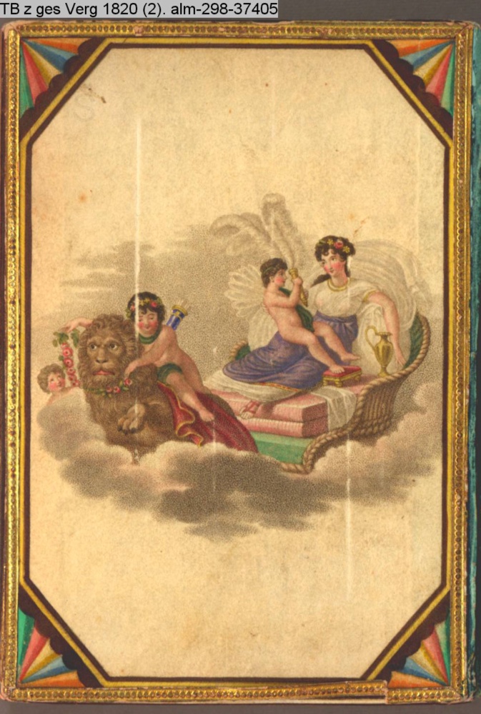 aufwendig kolorierte Umschlaggraphik v. mit montierter Goldleiste. Zum Vergleich ist die Abbildung der Umschlaggraphiken bei Lanckoronska/Rümann, Abbildungsteil S. 85 als Vollbild beigegeben