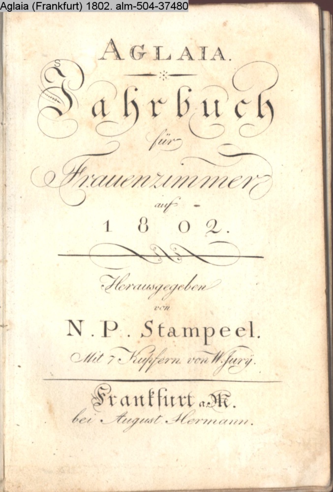 AGLAIA. / Jahrbuch / für / Frauenzimmer / auf / 1802. / Herausgegeben / von / N. P. Stampeel. / Mit 7 Kupfern von W. Jury. / Frankfurt a. M. / bei August Hermann