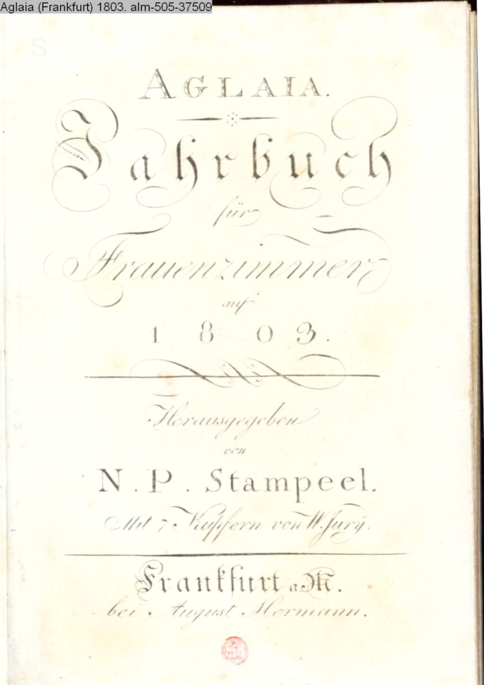 AGLAIA / Jahrbuch / für / Frauenzimmer / auf / 1803. / Herausgegeben / von / N. P. Stampeel. / Mit 7 Kupfern von W. Jury. / Frankfurt a. M. / bei August Hermann.