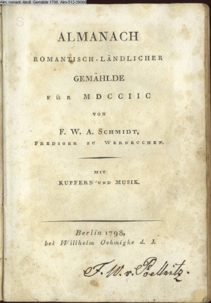 ALMANACH / ROMANTISCH-LÄNDLICHER / GEMÄHLDE / FÜR MDCCIIC / VON / F. W. A. SCHMIDT, / PREDIGER ZU WERNEUCHEN. / MIT KUPFERN UND MUSIK. / Berlin 1798, / bei Wilhelm Oehmigke d. J.
