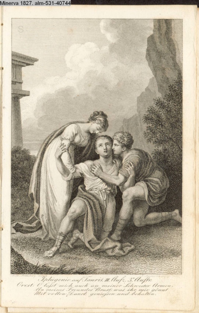 Iphigenie auf Tauris III. Aufz. 3r. Auftr. / Orest. O lasst mich auch an meiner Schwester Armen. / An meines Freundes Brust, was ihr mir gönnt / Mit vollen Dank geniessen und behalten