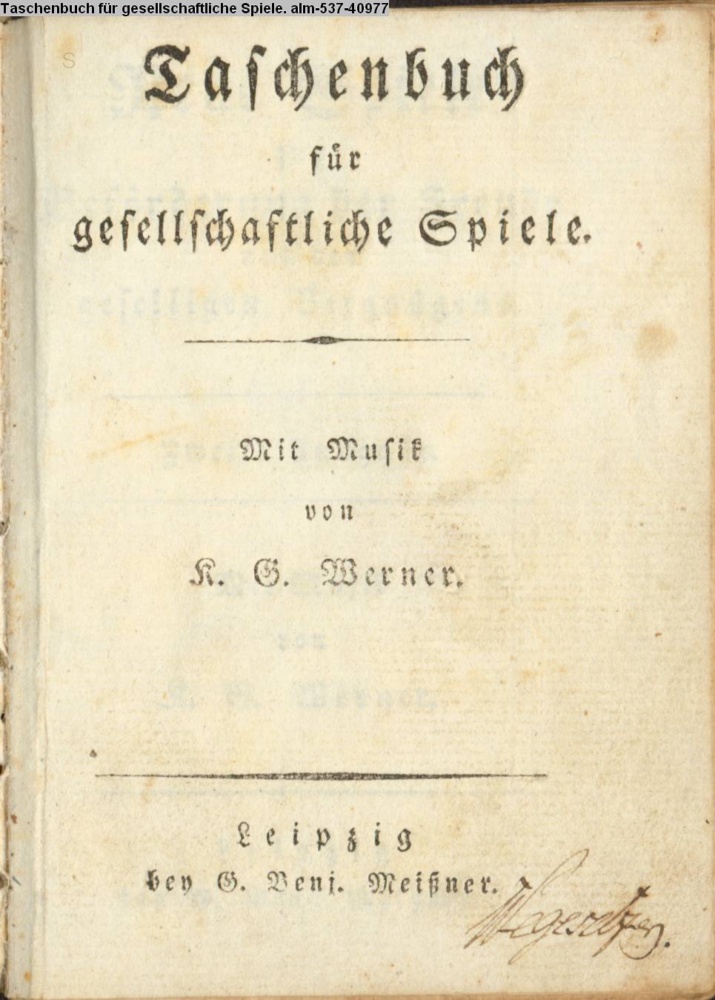 Neue Spiele / zur / Beförderung der Freude / und des geselligen Vergnügens. / Zweite Ausgabe. / Mit Musik / von K. G. Werner. / Leipzig / bey G. Benj. Meißner
