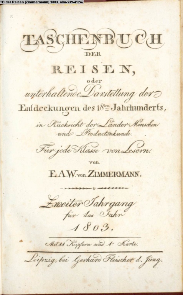 TASCHENBUCH / DER / REISEN / oder / unterhaltende Darstellung der / Entdeckungen des 18ten Jahrhunderts, / in Rücksicht der Länder Menschen / und Productenkunde. / Für jede Klasse von Lesern. / von / E. A. W. von ZIMMERMANN. / Zweiter Jahrgang / für das Jahr / 1803. / Mit 11 Kupfern und 1r Karte. / Leipzig, bei Gerhard Fleischer d. Jüng.