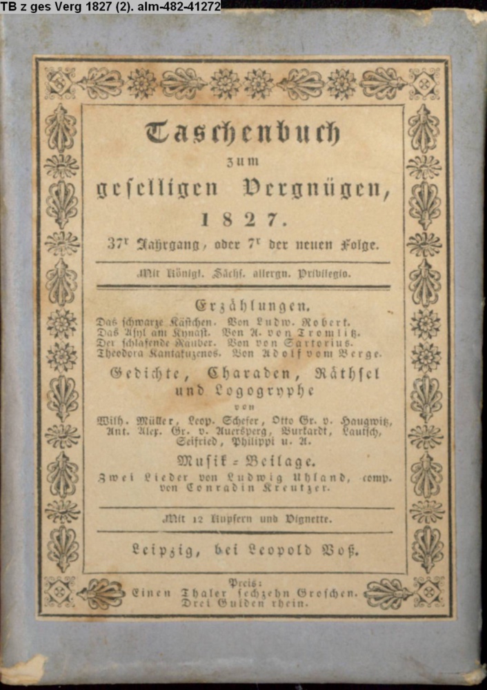 Taschenbuch / zum / geselligen Vergnügen, / 1827. / 37r. Jahrgang, oder 7r der neuen Folge. / Mit königl. Sächs allergn. Privilegio [...] / Leipzig, bei Leopold Voß. /