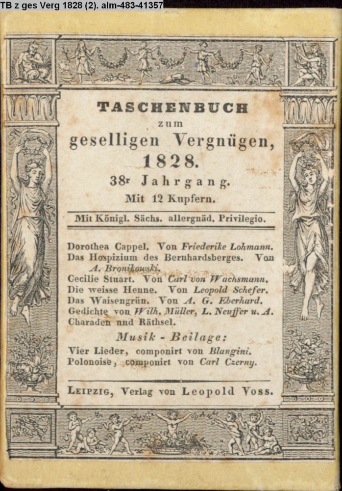 TASCHENBUCH / zum / geselligen Vergnügen, / 1828. / 38r. Jahrgang. / Mit 12 Kupfern. / Mit Königl. Sächs. allergnäd. Privilegio [...] / LEIPZIG, Verlag von Leopold Voss