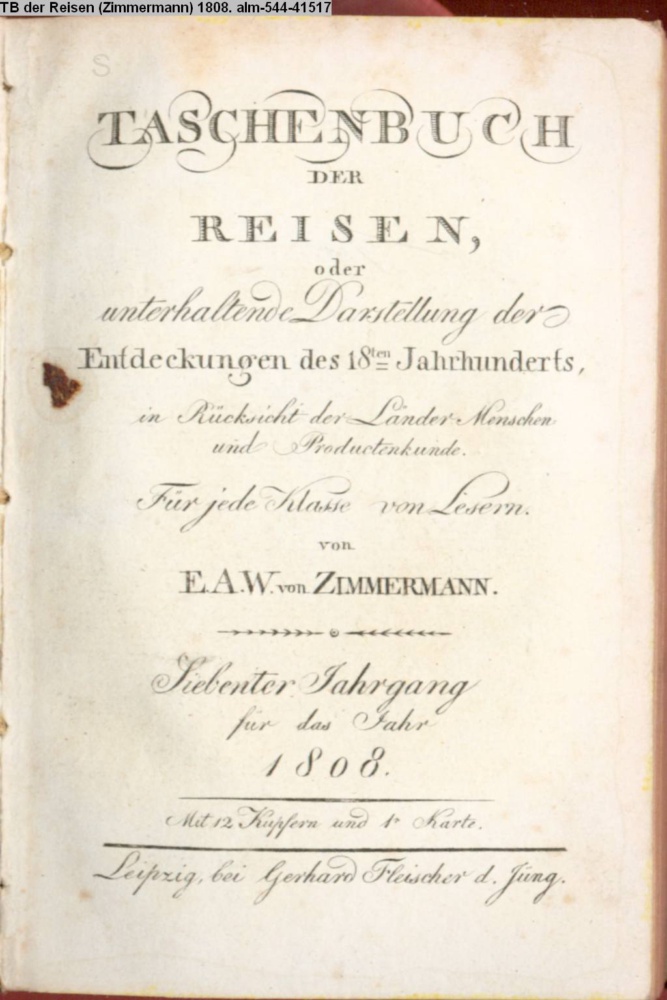 TASCHENBUCH / DER / REISEN / oder / unterhaltende Darstellung der / Entdeckungen des 18ten Jahrhunderts, / in Rücksicht der Länder Menschen / und Productenkunde. / Für jede Klasse von Lesern. / von / E. A. W. von ZIMMERMANN. / Siebenter Jahrgang / für das Jahr / 1808. / Mit 12 Kupfern und 1r Karte / Leipzig, bei Gerhard Fleischer d. Jüng.