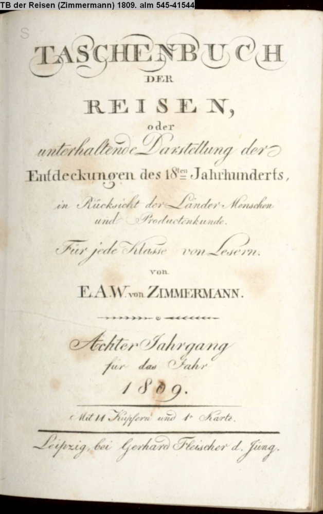 TASCHENBUCH / DER / REISEN / oder / unterhaltende Darstellung der / Entdeckungen des 18ten Jahrhunderts, / in Rücksicht der Länder Menschen / und Productenkunde. / Für jede Klasse von Lesern. / von / E. A. W. von ZIMMERMANN. / Achter Jahrgang / für das Jahr / 1809. / Mit 11 Kupfern und 1r Karte / Leipzig, bei Gerhard Fleischer d. Jüng.