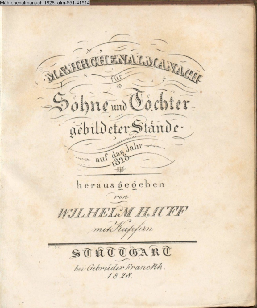 MAEHRCHENALMANACH / für / Söhne und Töchter / gebildeter Stände / auf das Jahr / 1828 / herausgegeben / von / WILHELM HAUFF / mit Kupfern / STUTTGART / bei Gebrüder Franckh. / 1828