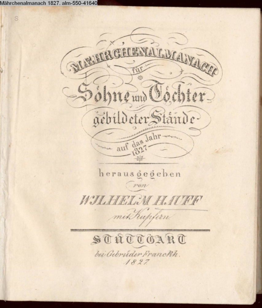 MAEHRCHENALMANACH / für / Söhne und Töchter / gebildeter Stände / auf das Jahr / 1827 / herausgegeben / von / WILHELM HAUFF / mit Kupfern / STUTTGART / bei Gebrüder Franckh. / 1827