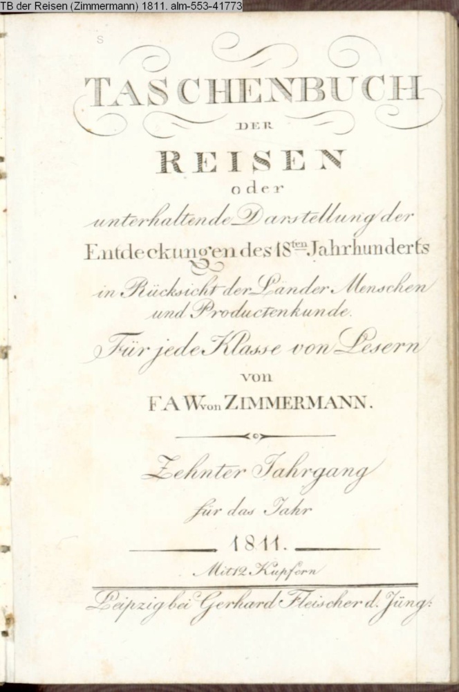 TASCHENBUCH / DER / REISEN / oder / unterhaltende Darstellung der / Entdeckungen des 18ten Jahrhunderts / in Rücksicht der Länder Menschen / und Productenkunde. / Für jede Klasse von Lesern. / von / E. A. W. von ZIMMERMANN. / Zehnter Jahrgang / für das Jahr / 1811. / Mit 12 Kupfern / Leipzig, bei Gerhard Fleischer d. Jüng.
