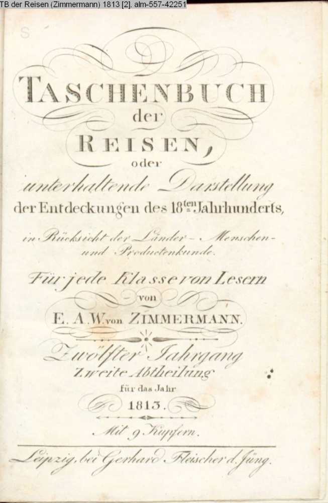 TASCHENBUCH / der / REISEN, / oder / unterhaltende Darstellung / der Entdeckungen des 18ten Jahrhunderts, / in Rücksicht der Länder- Menschen- / und Productenkunde. / Für jede Klasse von Lesern / von / E. A. W. von ZIMMERMANN. / Zwölfter Jahrgang / Zweite Abtheilung / für das Jahr / 1813. / Mit 9 Kupfern. / Leipzig, bei Gerhard Fleischer d. Jüng.