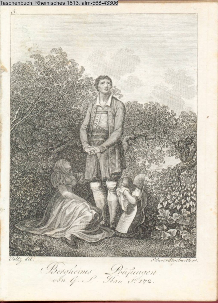 Graphik im Kalendarium paginiert 5. Illustration zu »Bergheims Prüfungen« von G. L. Rau in: Taschenbuch, Rheinisches 1812;