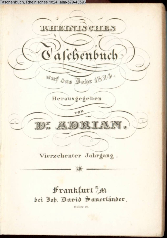 RHEINISCHES / Taschenbuch / auf das Jahr 1824. / Herausgegeben / von / Dr. ADRIAN. / Vierzehenter Jahrgang. / Frankfurt a/M / bei Joh. David Sauerländer