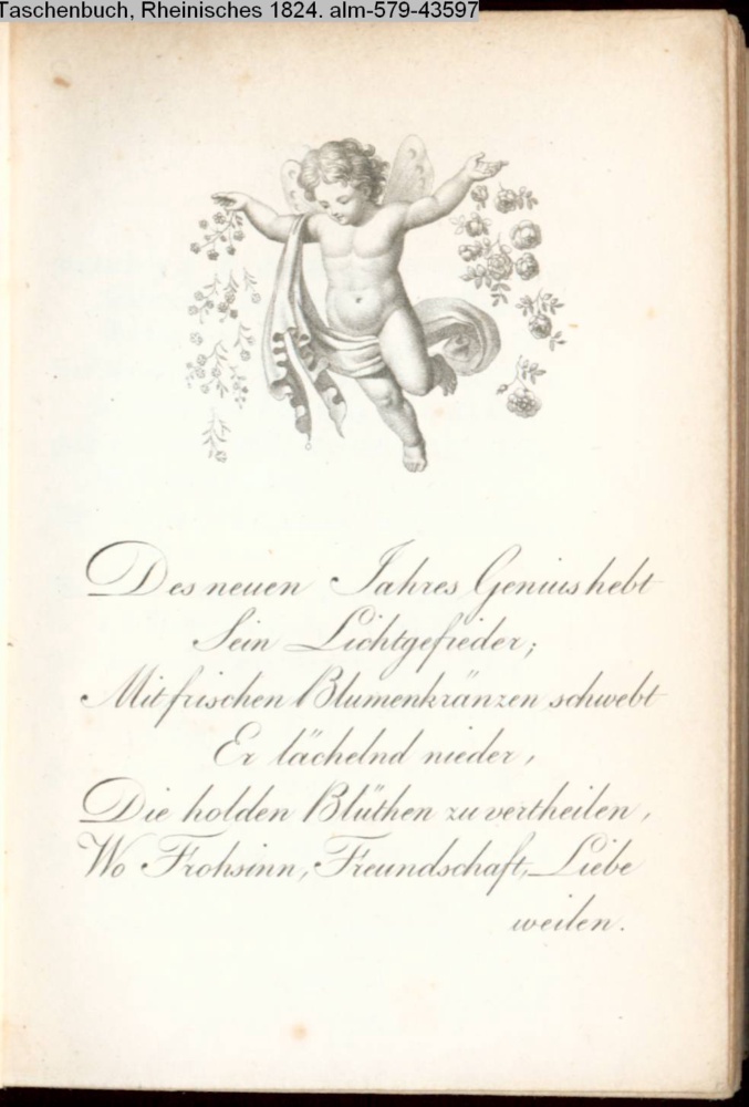 Des neuen Jahres Genius hebt / Sein Lichtgefieder, / Mit frischen Blumenkränzen schwebt / Er lächelnd nieder,…