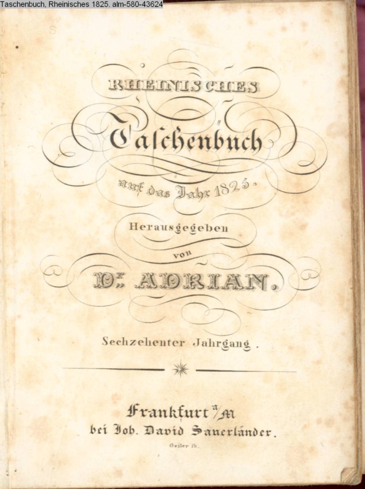 RHEINISCHES / Taschenbuch / auf das Jahr 1825. / Herausgegeben / von / Dr. ADRIAN. / Sechzehenter Jahrgang. / Frankfurt a/M / bei Joh. David Sauerländer