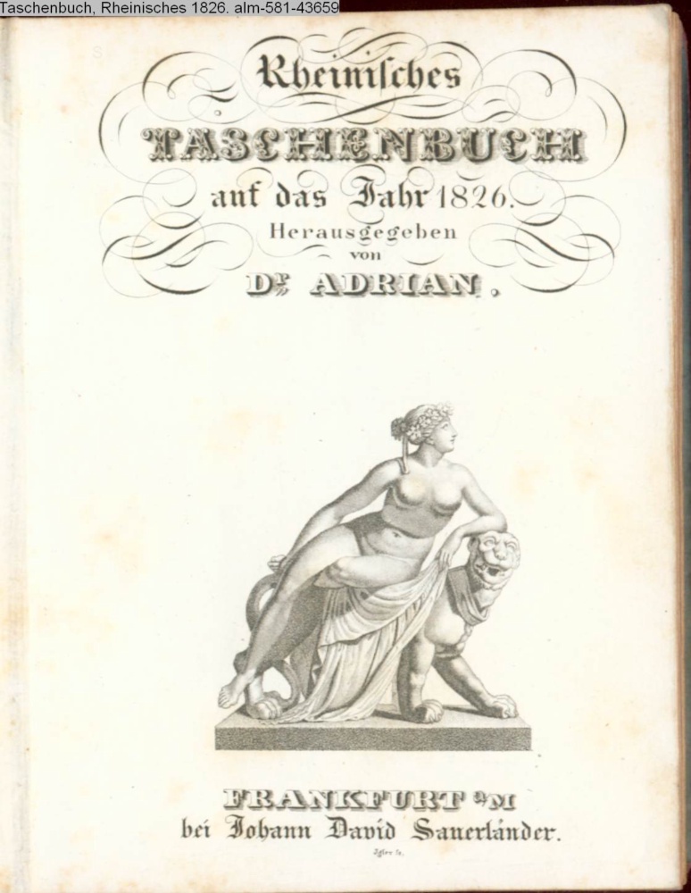Rheinisches / TASCHENBUCH auf das Jahr 1826. / Herausgegeben / von / Dr. ADRIAN. / FRANKFURT a/M. / bei Johann David Sauerländer
