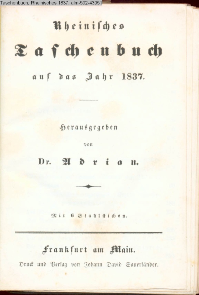 Rheinisches / Taschenbuch / auf das Jahr 1837. / Herausgegeben / von / Dr. Adrian. / Mit 6 Stahlstichen. / Frankfurt am Main. / Druck Verlag von Johann David Sauerländer