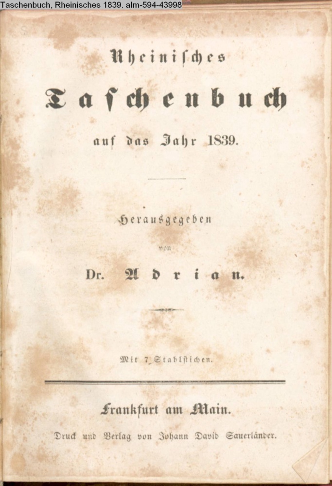 Rheinisches / Taschenbuch / auf das Jahr 1839. / Herausgegeben / von / Dr. Adrian. / Mit 7 Stahlstichen. / Frankfurt am Main. / Druck und Verlag von Johann David Sauerländer