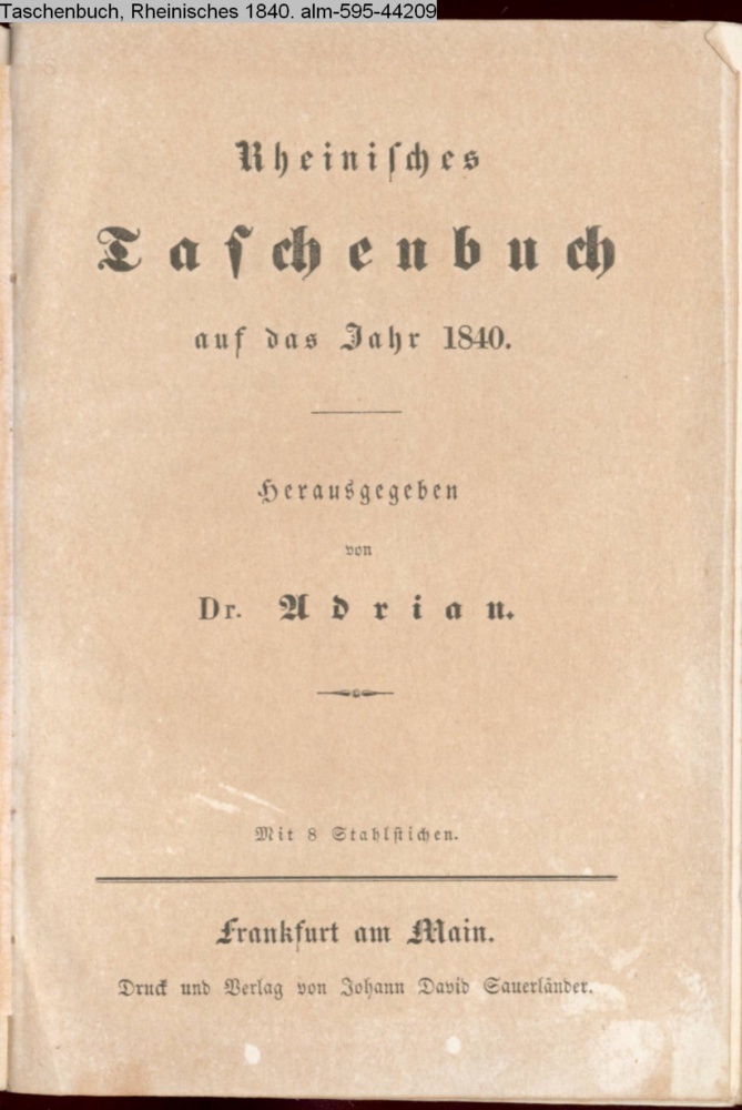 Rheinisches / Taschenbuch / auf das Jahr 1840. / Herausgegeben / von / Dr. Adrian. / Mit 8 Stahlstichen. / Frankfurt am Main. / Druck und Verlag von Johann David Sauerländer