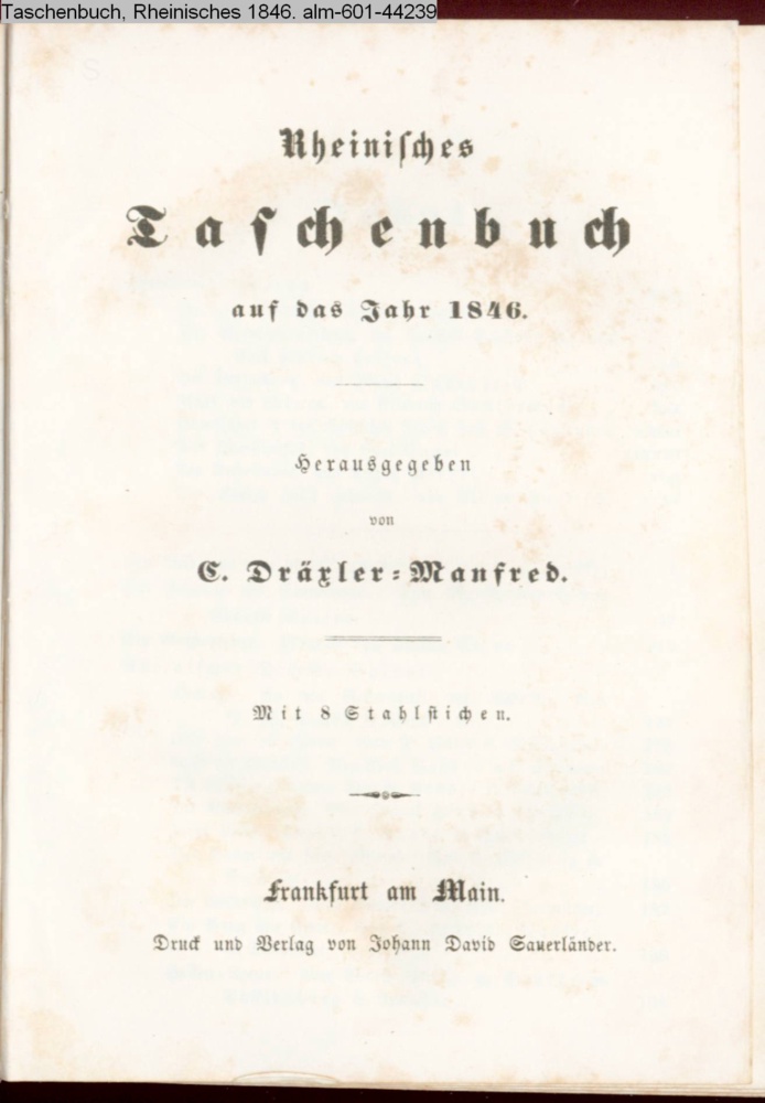 Rheinisches / Taschenbuch / auf das Jahr 1846. / Herausgegeben / von / C. Dräxler-Manfred. / Mit 8 Stahlstichen. / Frankfurt am Main. / Druck und Verlag von Johann David Sauerländer