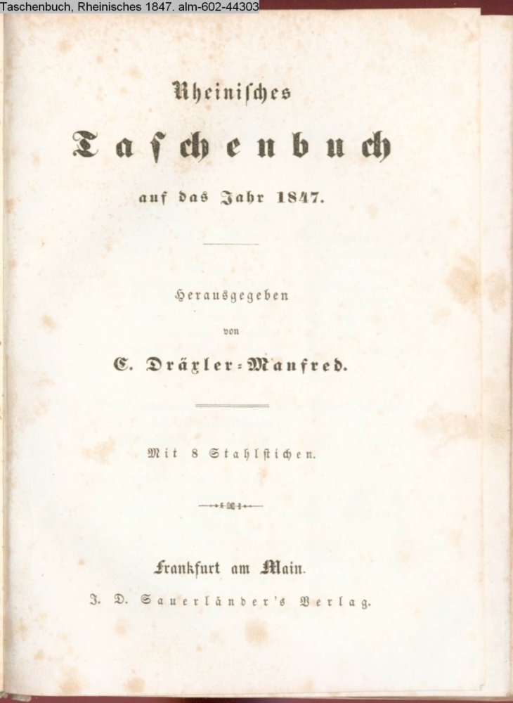 Rheinisches / Taschenbuch / auf das Jahr 1847. / Herausgegeben / von / C. Dräxler-Manfred. / Mit 8 Stahlstichen. / Frankfurt am Main. / J. D. Sauerländer's Verlag
