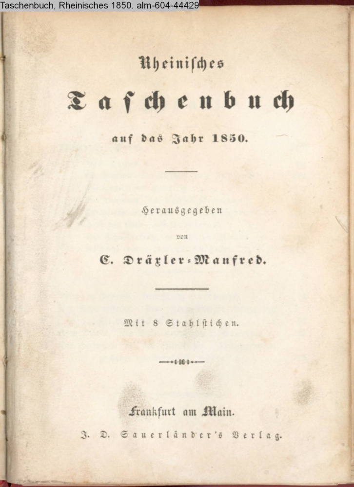 Rheinisches / Taschenbuch / auf das Jahr 1850. / Herausgegeben / von / C. Dräxler-Manfred. / Mit 8 Stahlstichen. / Frankfurt am Main. / J. D. Sauerländer's Verlag