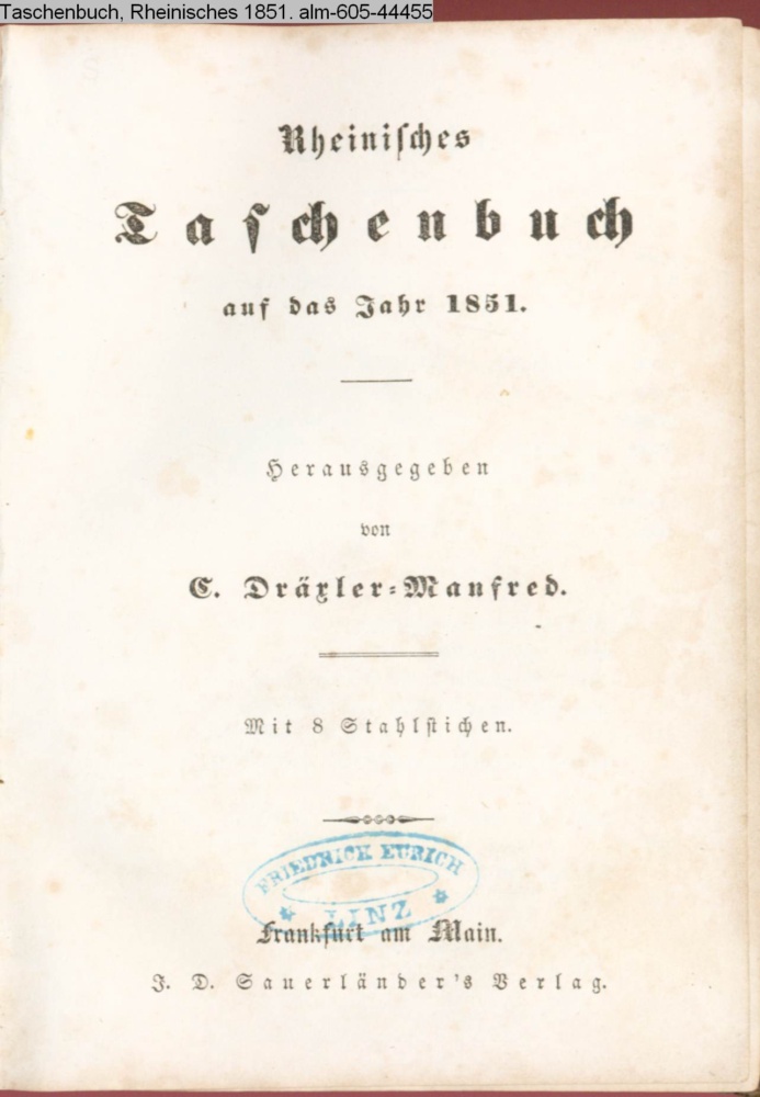 Rheinisches / Taschenbuch / auf das Jahr 1851. / Herausgegeben / von / C. Dräxler-Manfred. / Mit 8 Stahlstichen. / Frankfurt am Main. / J. D. Sauerländer's Verlag