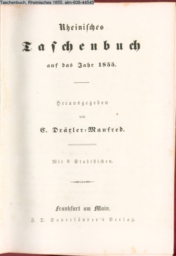 Rheinisches / Taschenbuch / 1855. / Herausgegeben / von / C. Dräxler-Manfred. / Mit 8 Stahlstichen. / Frankfurt am Main. / J. D. Sauerländer's Verlag