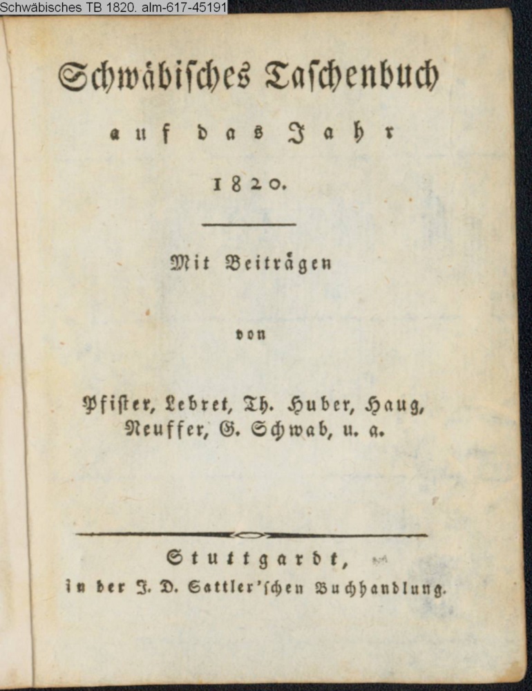 Schwäbisches Taschenbuch / auf das Jahr / 1820. / Mit Beiträgen / von / Pfister, Lebret, Th. Huber, Haug, / Neuffer, G. Schwab, u. a. / Stuttgardt, in der J. D. Sattler'schen Buchhandlung