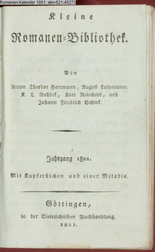 Kleine Romanen-Bibliothek / Von / Anton Theodor Hartmann, August Lafontaine, / K. L. Rahbek, Karl Reinhard, / und / Johann Friedrich Schink / Jahrgang 1801. / Mit Kupferstichen und einer Melodie. / Göttingen, / in der Dieterichischen Buchhandlung. / 1801