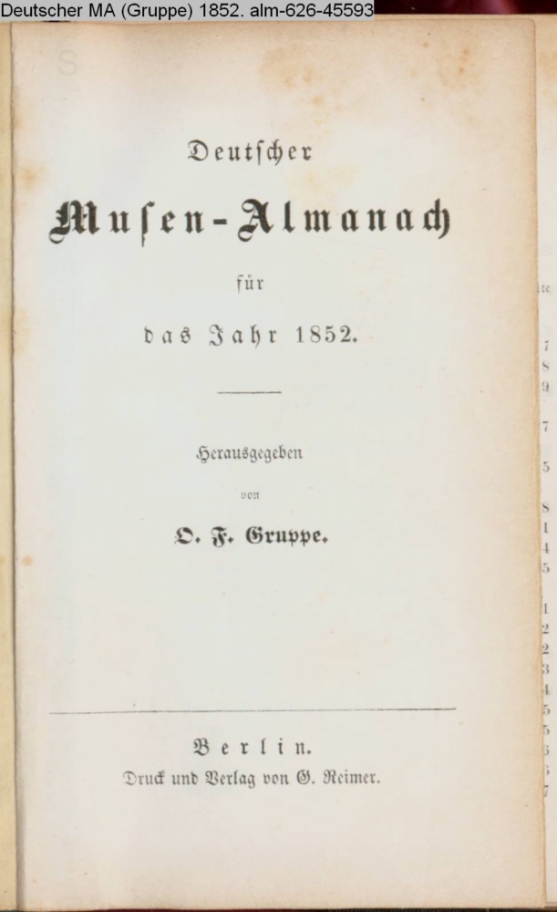 Deutscher / Musen-Almanach / für / das Jahr 1852. / Herausgegeben / von O. F. Gruppe. / Berlin. / Druck und Verlag von G. Reimer