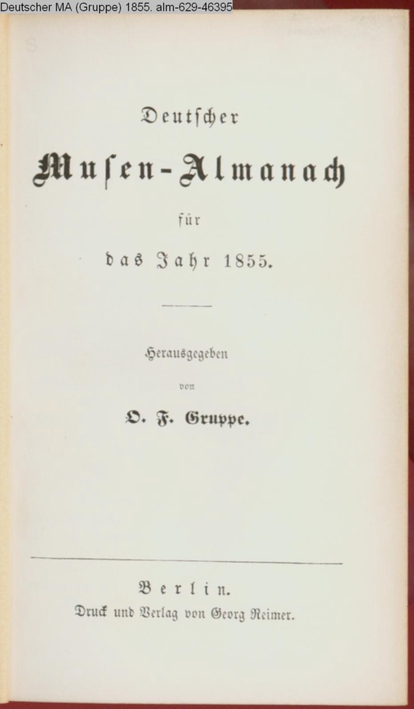 Deutscher / Musen-Almanach / für / das Jahr 1855. / Herausgegeben / von O. F. Gruppe. / Berlin. / Druck und Verlag von Georg Reimer