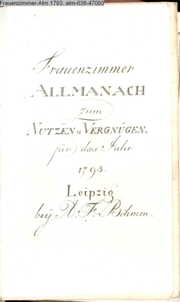 Frauenzimmer / ALLMANACH / zum / NUTZEN u. VERGNÜGEN. / für das Jahr / 1793. / Leipzig / bey A. Fr. Böhmen