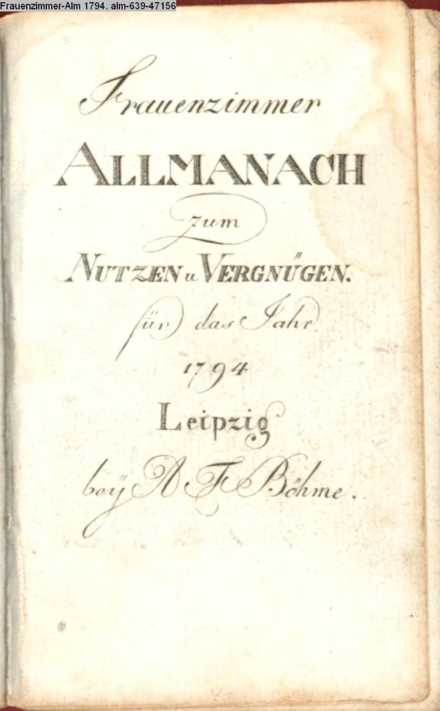 Frauenzimmer / ALLMANACH / zum / NUTZEN u. VERGNÜGEN. / für das Jahr / 1794. / Leipzig / bey A. Fr. Böhme