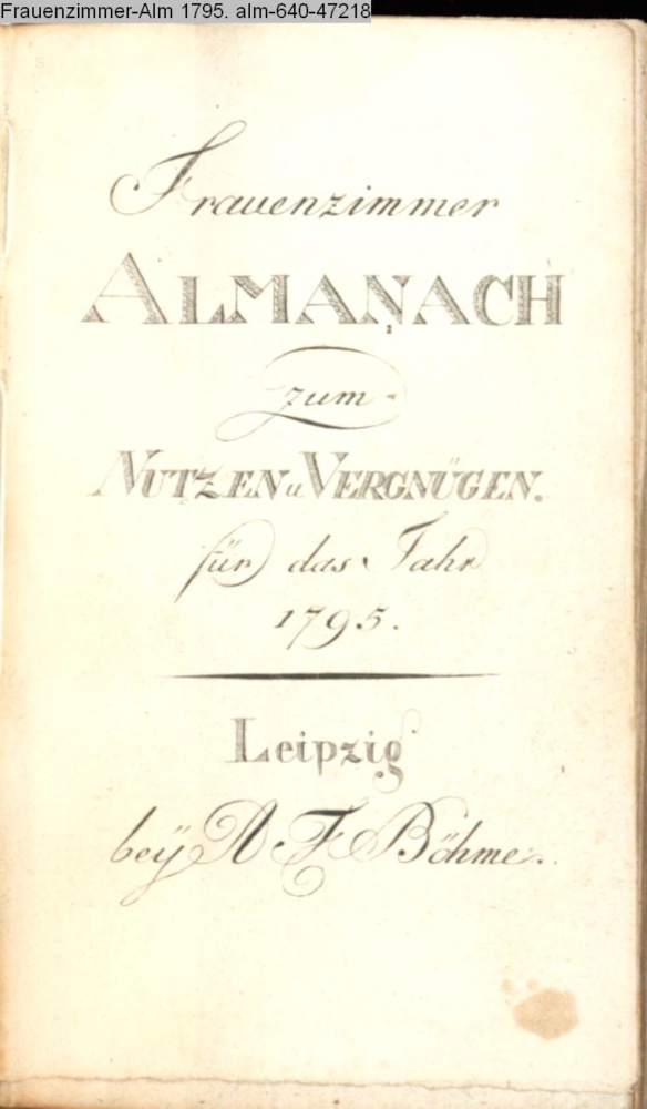 Frauenzimmer / ALMANACH / zum / NUTZEN u. VERGNÜGEN. / für das Jahr / 1795. / Leipzig / bey A. F. Böhme