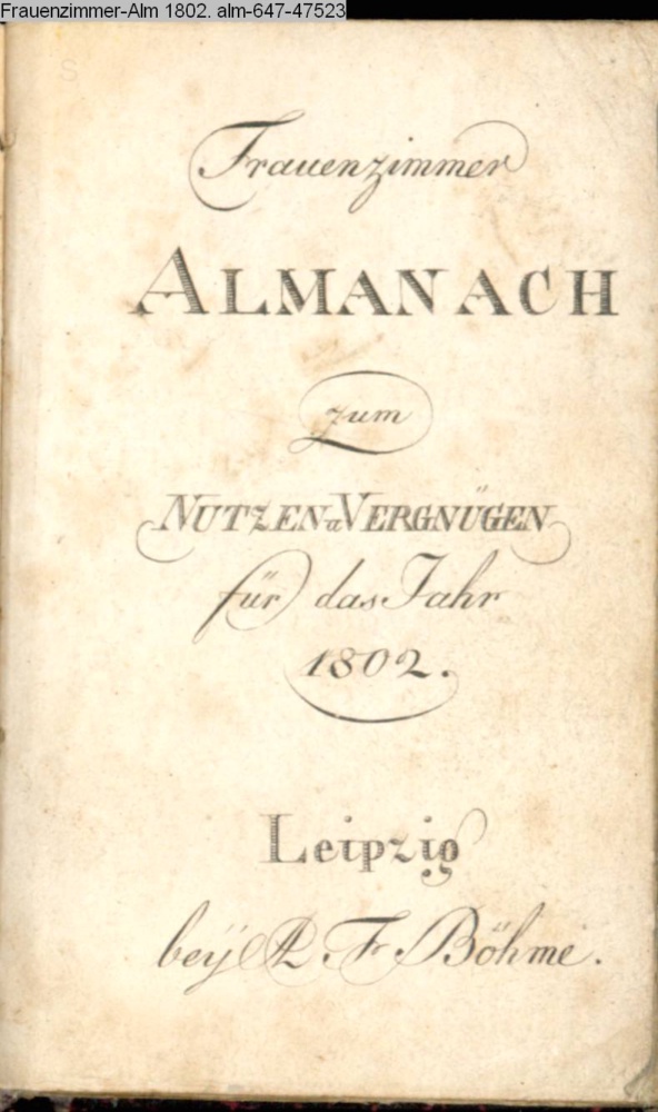 Frauenzimmer / ALMANACH / zum / NUTZEN u. VERGNÜGEN. / für das Jahr / 1802. / Leipzig / bey A. F. Böhme