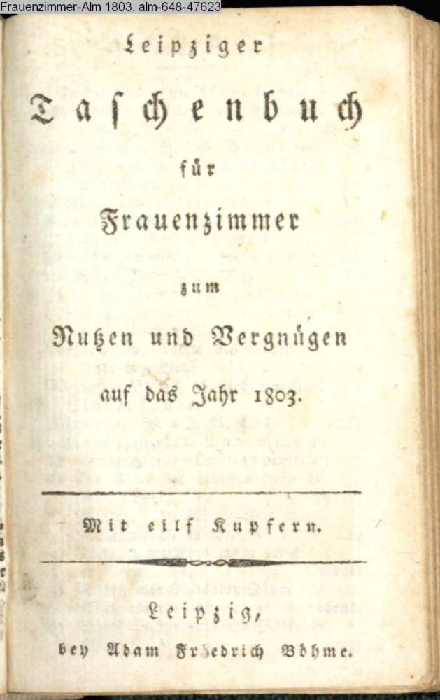 Leipziger / Taschenbuch / für / Frauenzimmer / zum / Nutzen und Vergnügen / auf das Jahr 1803. / Mit Kupfern. / Leipzig, / bey Adam Friedrich Böhme