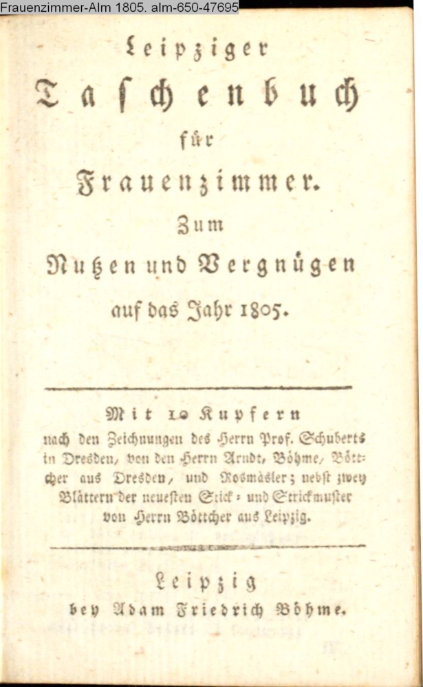 Leipziger / Taschenbuch / für / Frauenzimmer / zum / Nutzen und Vergnügen / auf das Jahr 1805. / Mit 10 Kupfern / nach den Zeichnungen des Herrn Prof. Schuberts / in Dresden, von den Herrn Arndt, Böhme, Bött-/cher aus Dresden, und Rosmäsler; nebst zwey Blättern der neuesten Stick- und Strickmuster / nach Herrn Böttcher aus Leipzig. Leipzig / bey Adam Friedrich Böhme