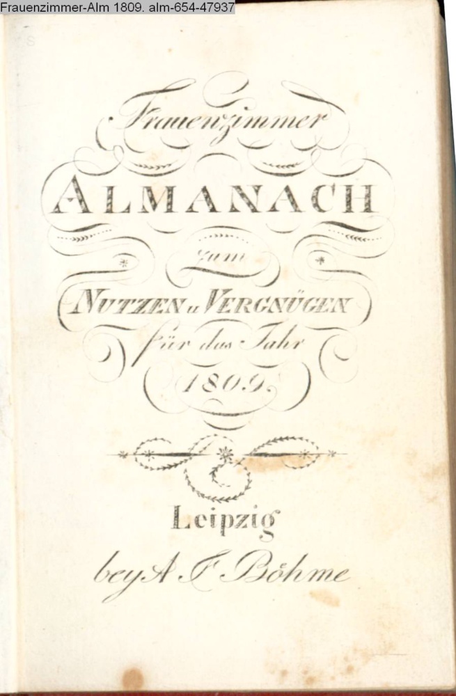 Leipziger / Taschenbuch / für / Frauenzimmer, / zum / Nutzen und Vergnügen / auf das Jahr 1809. / Mit zehn Kupfern, / von Jury, Bolt, Meno-Haas, Ros- / mäsler und Böhme, nach / Zeichnungen von / Schubert, / und Schnorr v. K. / Leipzig, / bey Adam Friedrich Böhme