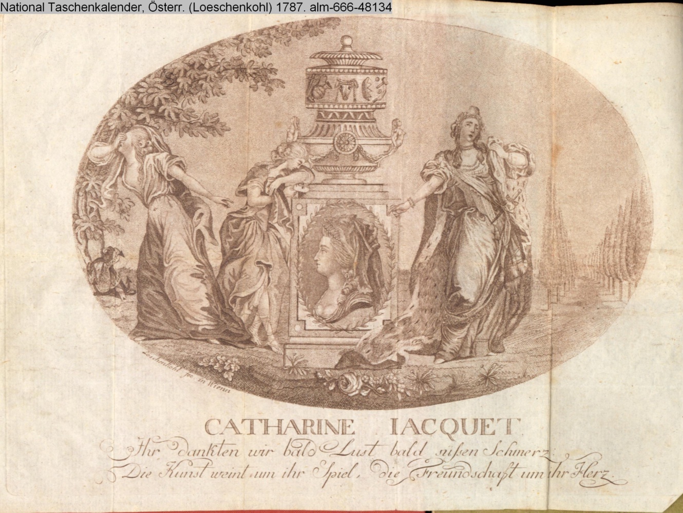 CATHARINE JACQUET. / Ihr dankten wir bald Lust bald süßen Schmerz: / Die Kunst weint um ihr Spiel, die Freundschaft um ihr Herz