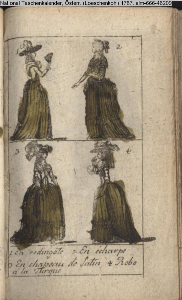 1 En redingote 2 En écharpe / 3 En chapeau de Satin 4 Robe / à la Turque