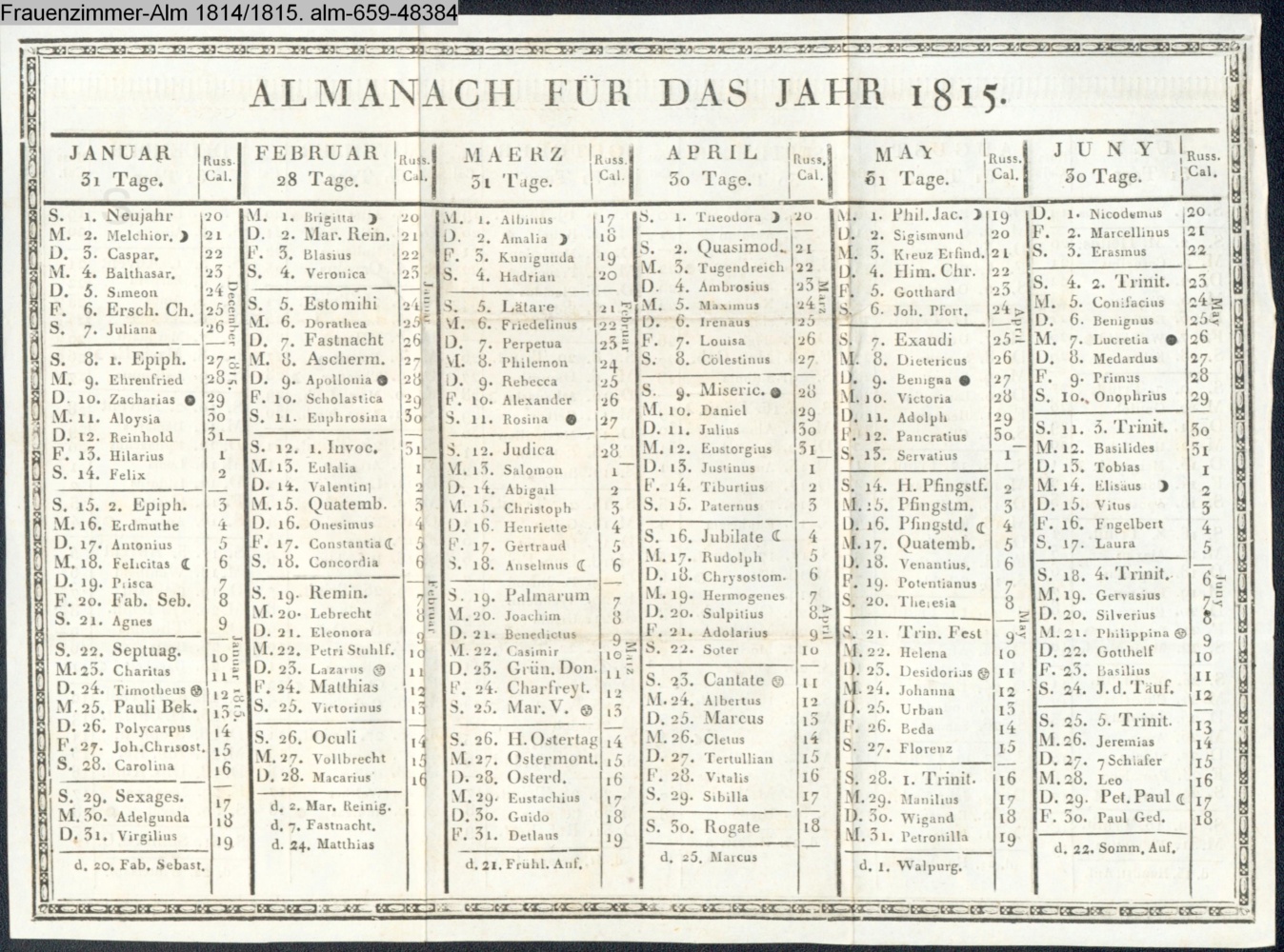 ausfaltbares Kalendarium 1815 r.: Jan.-Jun.
