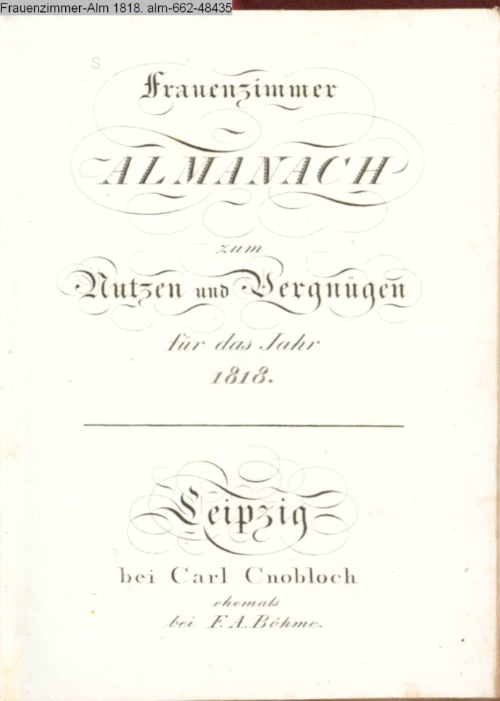 Frauenzimmer / ALMANACH / zum / Nutzen und Vergnügen / für das Jahr / 1818. / Leipzig / bei Carl Cnobloch. / ehemals / bei A. F. Böhme