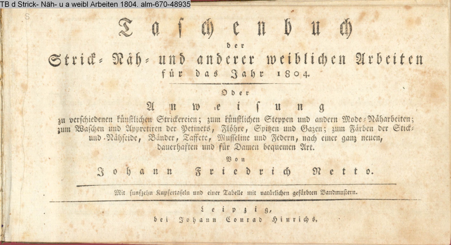 Taschenbuch / der / Strick- Näh- und anderer weiblichen Arbeiten / für das Jahr 1804. / Oder / Anweisung / zu verschiedenen künstlichen Strickereien; zum künstlichen Steppen und andern Mode-Näharbeiten; / zum Waschen und Appretiren der Petinets, Flöhre, Spitzen und Gazen; zum Färben der Stick- / und Nähseide, Bänder,Taffete, Musseline und Federn, nach einer ganz neuen, / dauerhaften und für Damen bequemen Art. / Von / Johann Friedrich Netto. / Mit funfzehn Kupfertafeln und einer Tabelle mit natürlichen gefärbten Bandmustern. / Leipzig, / bei Johann Conrad Hinrichs